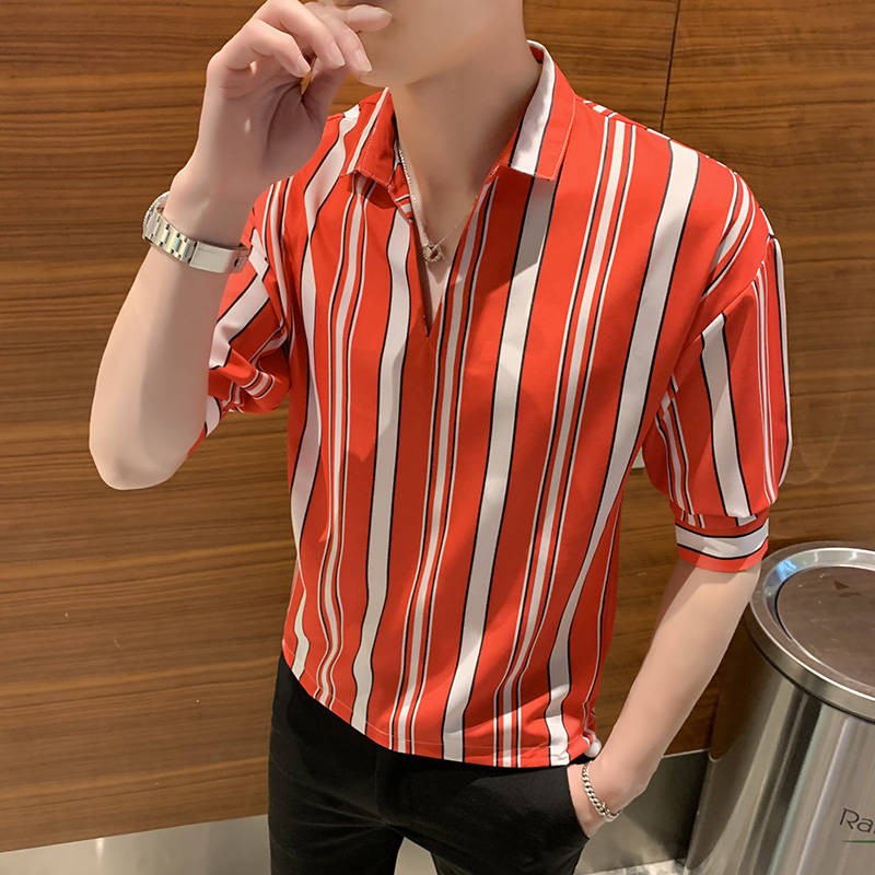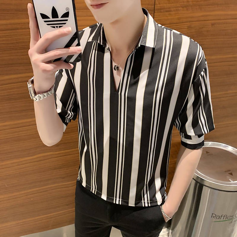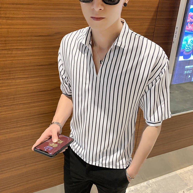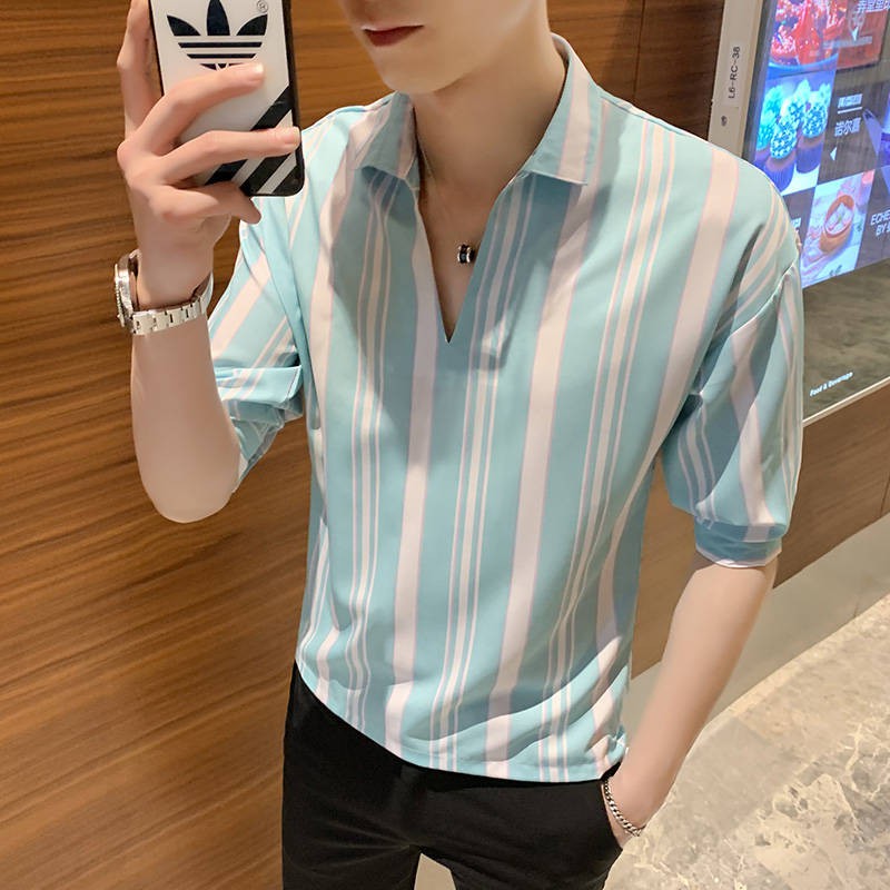 Striped Shirt Baju Lelaki Musim Panas 7 Lengan Lengan Trend Slim Kemeja Bergaris Berdiri Tegak Versi Korea Kemeja Lengan Pendek Kasual Liar Shopee Malaysia
