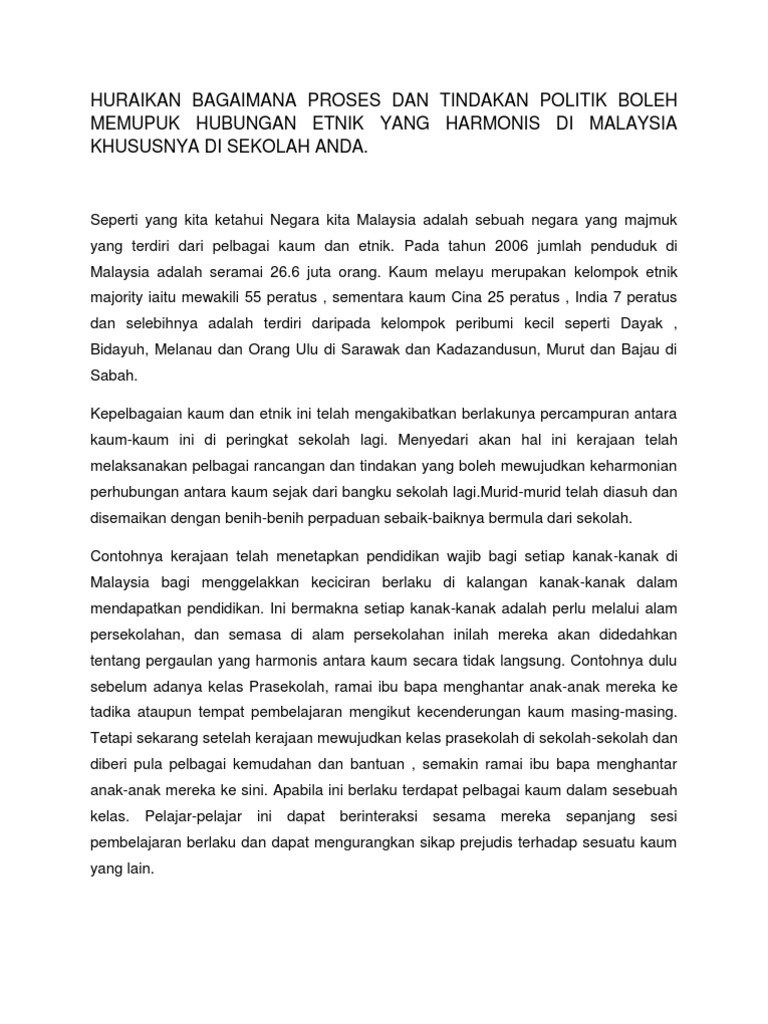 Huraikan Bagaimana Proses Dan Tindakan Politik Boleh Memupuk Hubungan Etnik Yang Harmonis Di Malaysia Khususnya Di Sekolah Anda